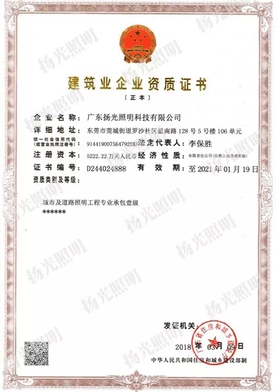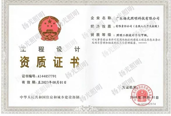 道路照明工程施工壹級,照明工程設計專項資質甲級的“雙甲”企業,“雙甲”資質的取得體現了行業和市場對公(gōng)司綜合實力的高度認可,意味著可以承接任何規模的(de)